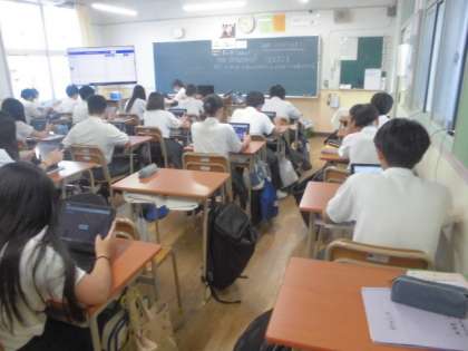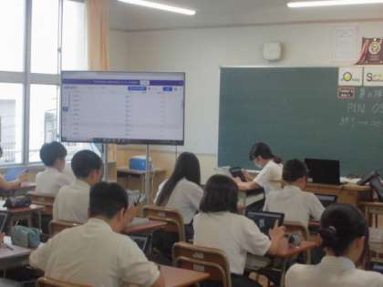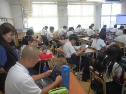 Kahoot!をしています。1年生全体で夏休みの宿題に出ていた単語の定着を競っています。ランキング形式で表示されるので、みんな真剣に取り組んでいました!