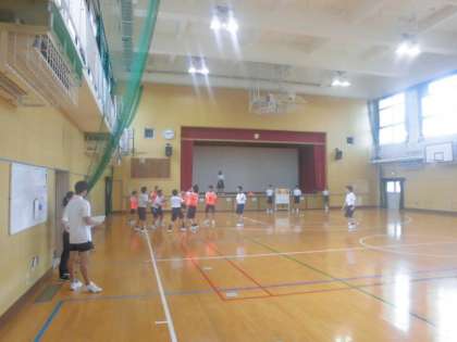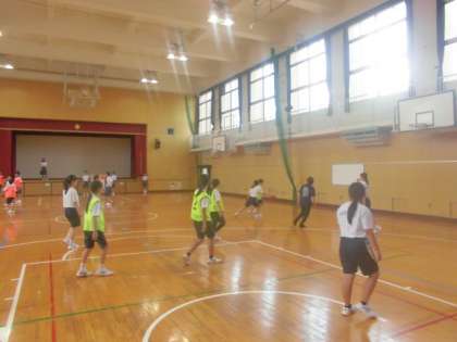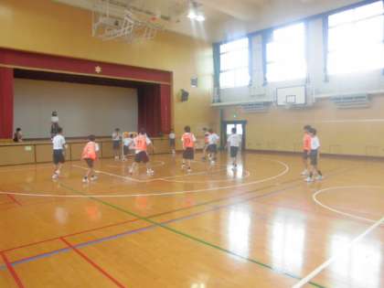 女子も男子も今日は体育館でバスケットボールをしています。一緒に先生もプレーしていました。