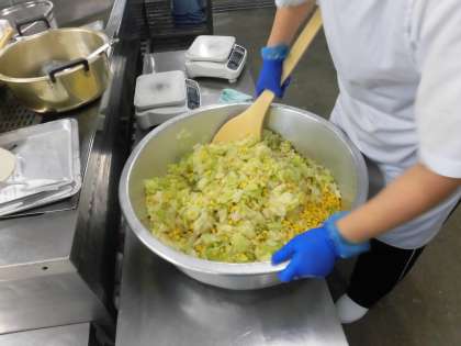 ・チキンカレーライス ・キャベツとコーンのサラダ ・ミニフィッシュ ・牛乳  です。