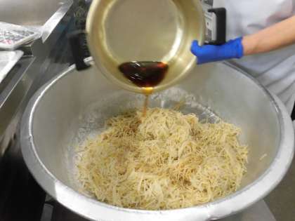 今日の給食はオイスターソース焼きそば、もやしの中華あえ、ぶどう(巨峰)、ミニコッペパン、牛乳です。