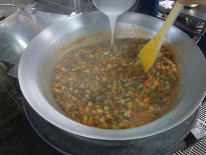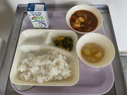 今日の給食はハヤシライス 、グリーンアスパラガスとコーンのサラダ 、洋なし(カット缶) 、牛乳です。