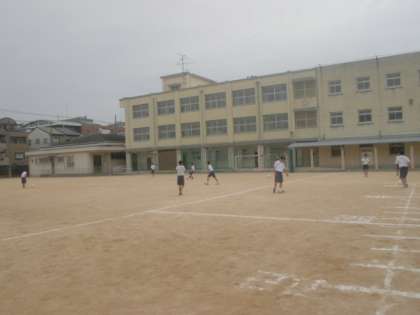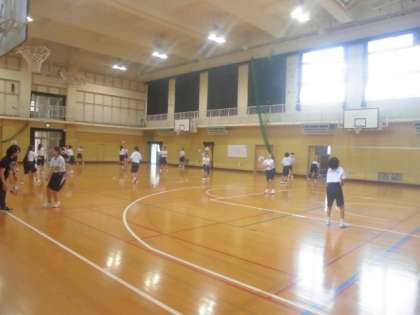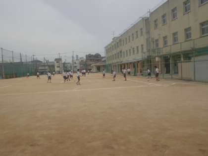 男子は運動場でサッカーの二人組のパスをしています。女子は体育館でバレーボールのアンダーハンドパスの練習をしています。