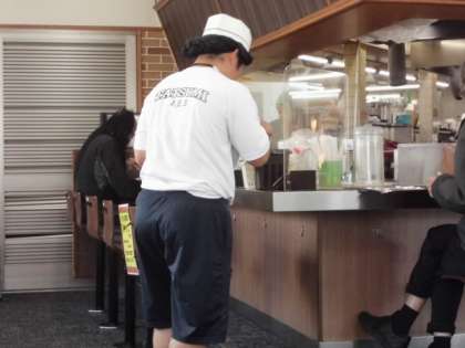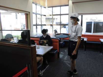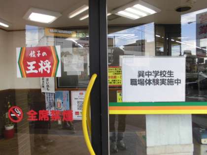 餃子の王将巽店の様子です。お店のドアには「巽中学校職場体験実施中」の張り紙をしてもらっています。接客にも身が入ります。