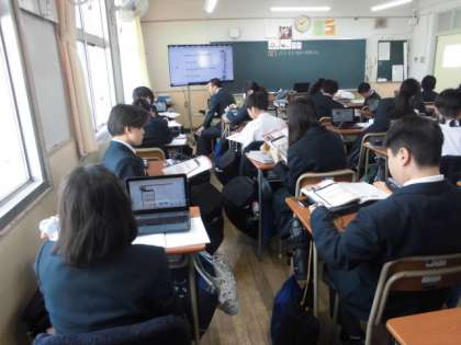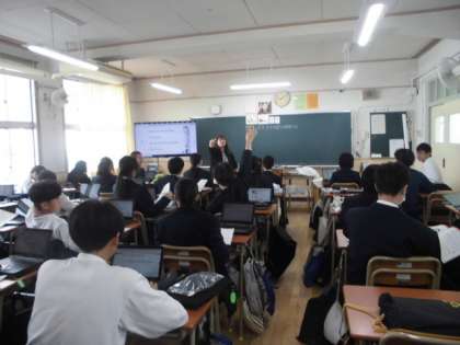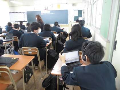 ロンドンへのオンラインツアーの会話を二人一組になり、お互い役になりきって話しています。