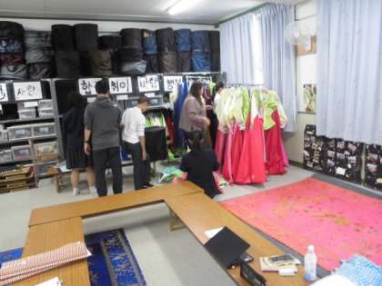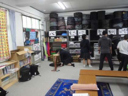 ウリ文化部では、衣装の整理や楽器の片付けを行っています。大きさなども確かめ、丁寧に整理していました。