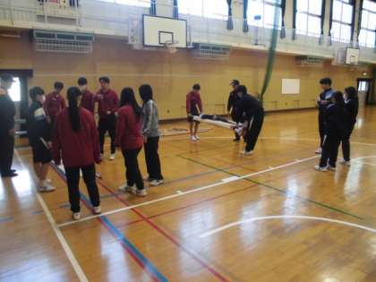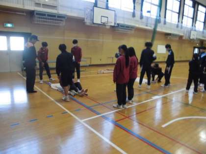 3年生は体育館で搬送訓練とレジ袋を利用した応急処置について、教えてもらっています。