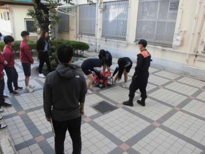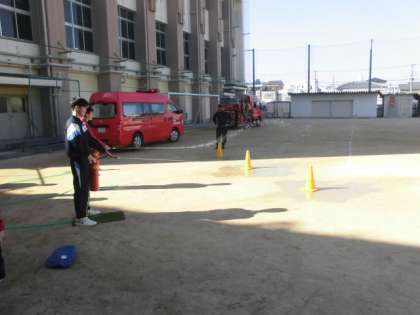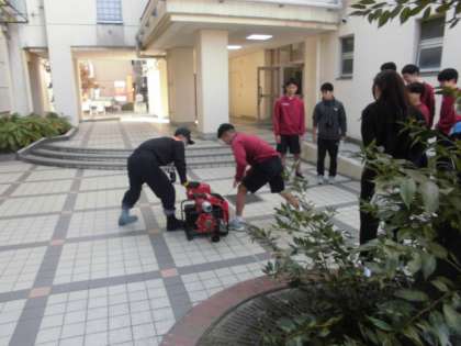 運動場では、水消火器を使った「初期消火訓練」を行ったり、発電機の使い方を教えてもらったりしています。