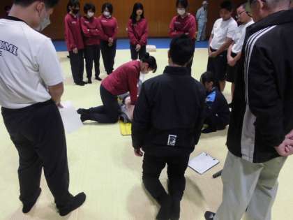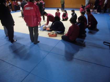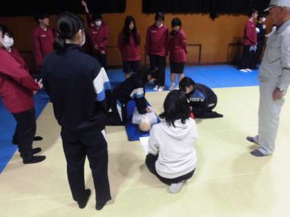 2年生は格技室で、まず救急救命のVTRを見てから、実際に人形を使って、胸骨圧迫や人工呼吸、AEDの使い方などを体験しています。