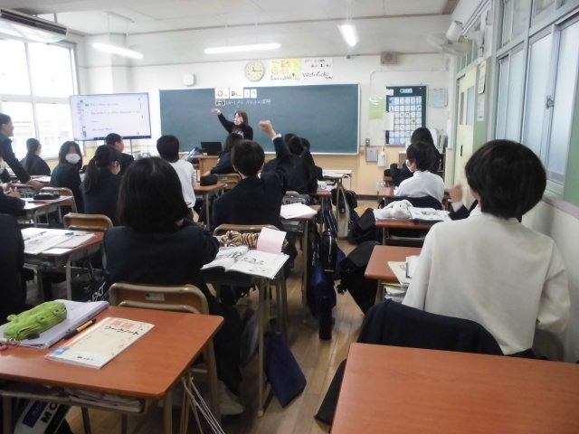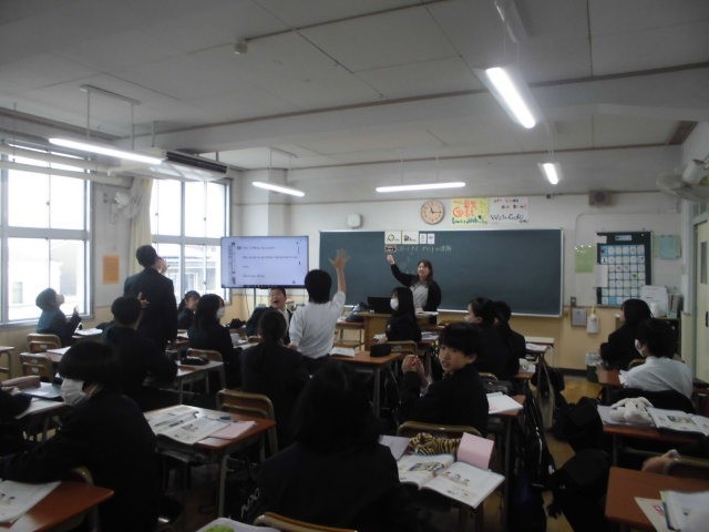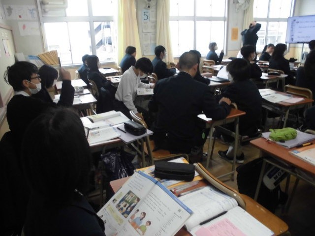 二人一組になり、本文の読み合わせをしています。何人かがみんなの前で発表してくれました。発音がとても良い人もいます。