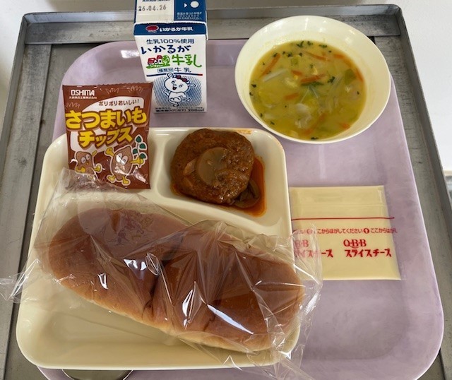 今日の給食は煮こみハンバーグ、コーンスープ、おさつチップス、黒糖パン、牛乳です。