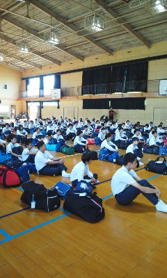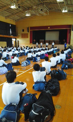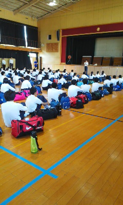 3年生は、出発式を終え修学旅行に支援頂く添乗員の方、看護師さん、ボランティアの仲井コーチの紹介がありました。