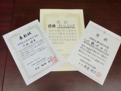 表彰がありました。男子バレーボール部新人講習会で優勝。ラグビーフットボール大会にて久田選手が優秀選手で表彰、大阪市立総合文化祭で生活部藤井さんが優秀作品で表彰を受賞しました。