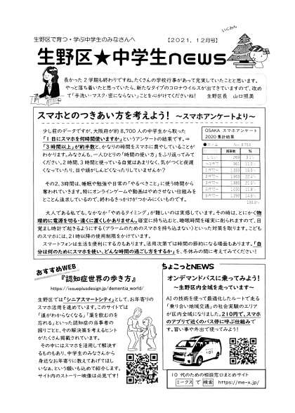 生野区 中学生NEWS 12月号 が届きましたので掲載します。