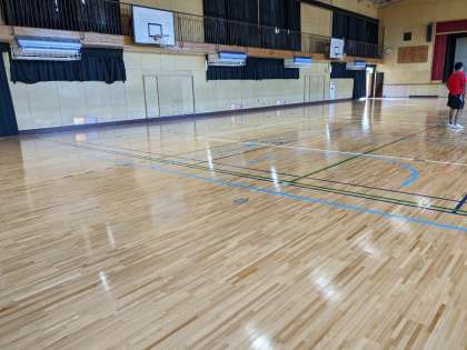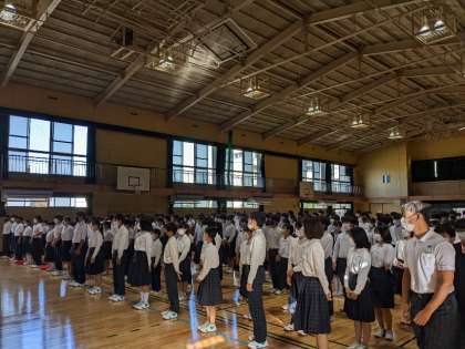 本日、認証式・全校集会がありました。夏休みに工事をして、ピカピカの床になった体育館で行いました。
