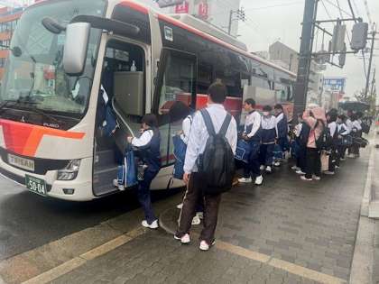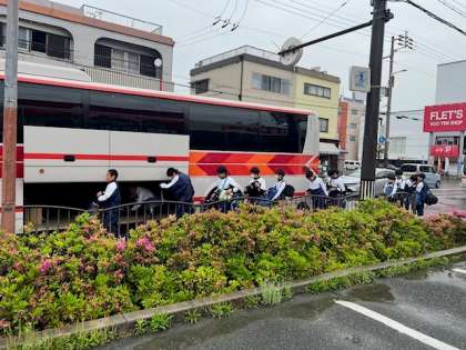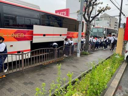 クラスごとにバスに乗り込みます。
