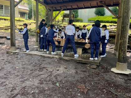 係りに分かれて材料、薪、道具を取りに行ってます。