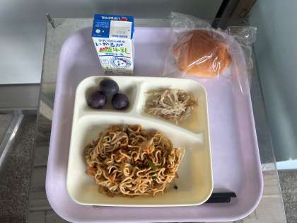 今日の給食は、オイスターソースを使用した中華風の焼きそばです。
