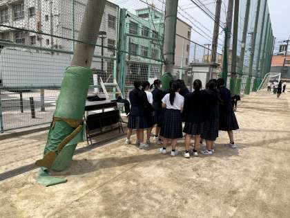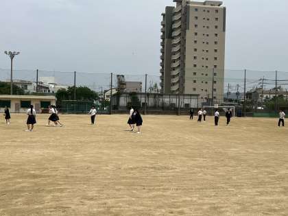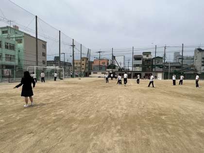 天気が良く昼休みに、たくさんの生徒が運動場にきていました。