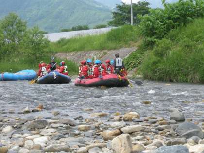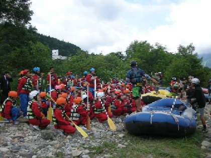 ウエットスーツに着替え、ライフジャケットも装着し、準備が整いました。インストラクターの説明を聞く顔も真剣です。