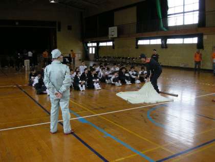 防災体験学習(簡易担架講習・体験)の様子です。