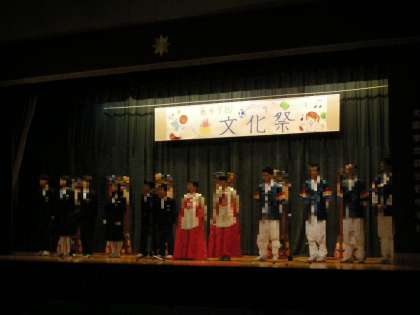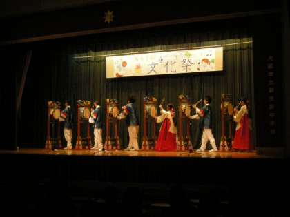 朝鮮文化研究部の発表(ヤンミョンプク「両面太鼓」の演奏と歌「故郷の春の小川」の合唱)の様子です。