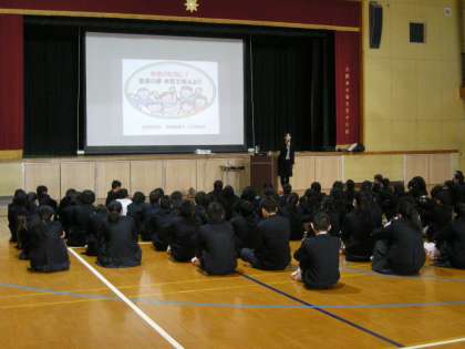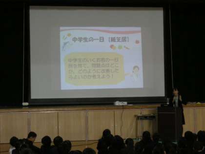 生野区保健福祉センターより管理栄養士の方を講師としてお招きし、食育出前講座をしていただきました。1年生の皆さんは、熱心に話を聞いていました。