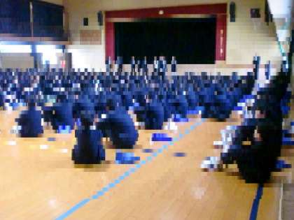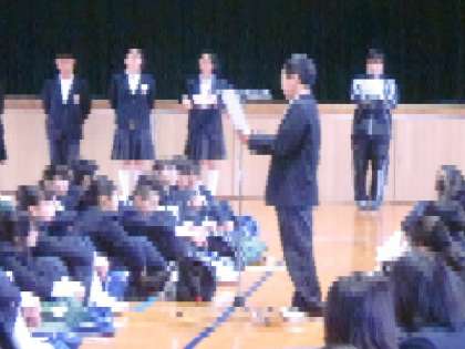 本日、始業式がありました。本年度皆で意識して取り組む目標である。「認め合い・高め合い・響き合う」の講話があった後、新転任の教職員の紹介と、大和スクール・カウンセラーからのお話を聴きました。始業式が終わり、生徒会主催の対面式が行われました。