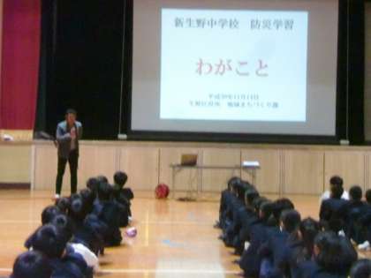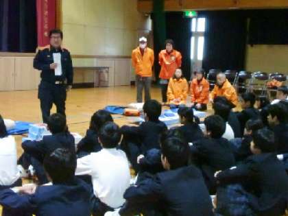 本日、防災学習をしました。地震や台風、大雨などの震災に備えて、自らでどうするか「自分のこととして」この学習に取り組んでほしいとのあいさつの後、生野区地域まちづくり課の方からの防災学習のお話、地域の方と生野消防署の方々のご指導で救急救命の実習を行いました。