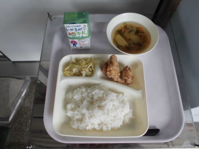 本日の給食は、ごはん、牛乳、鶏肉のたつたあげ、五目汁、キャベツの梅風味でした。
