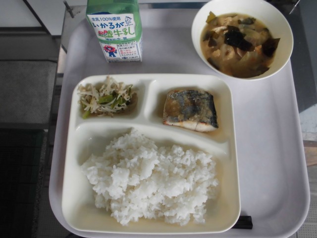 本日の給食は、ごはん、牛乳、さごしのおろしじょうゆかけ、みそ汁、もやしとピーマンのいためものでした。