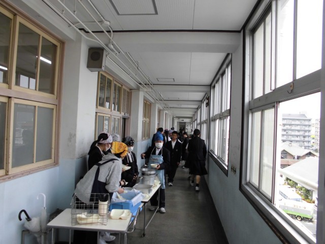 今日は1年生のフロアにお邪魔しました。給食当番の生徒たちは、協力しながら手際よく配膳を行っており、スムーズに準備が進んでいました。3組と4組では、おかずや牛乳をかけた“じゃんけん大会”も行われ、教室は明るくにぎやかな雰囲気に包まれていました。