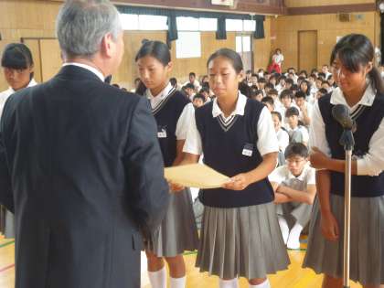 9月6日(土)に行われた、第9回ダンロップカップ大阪市大会大阪市体育協会会長杯大阪市中学校ソフトテニス女子新人研修大会で第3位になり、全校集会で表彰されました。