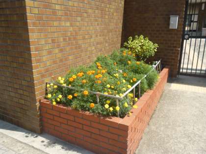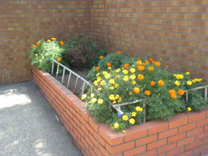 7月1日(火)に管理作業員の中川さんと住田さんが植え替えてくれた正門前左右の花壇の花、マリーゴールド(黄色・オレンジ色)と日日草(白色)が満開に咲いています♪