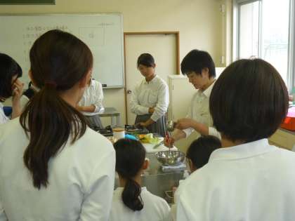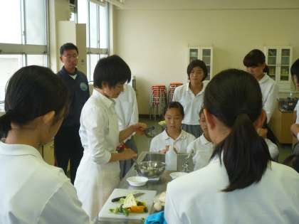 調理室で健康栄養の講座を受け、キャベツとパプリカときゅうりのサラダとそれにかける手作りマヨネーズを作りました。