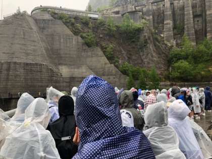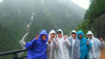 雨の中ですが、写真撮影も。元気な中学生といえど、ぼちぼち疲れも出てくる頃でしょう。さぁ、昼食場所の「わさび大王」へ向かいます。わさび農園の雰囲気はほかの農園と一味違います。楽しみに移動しましょう。