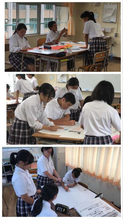 先日、職場体験学習を終えた二年生はさっそく報告会に向け、ポスター作りが始まりました。少ない時間の中で、班で役割分担をしながら作っています。1年生のときはパワーポイントを使って発表会を行いましたが、今回は「ポスターセッション」形式で「仕事の魅力」「私たちの未来」というテーマで調べ体験してきたことを発表します。