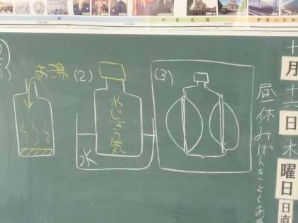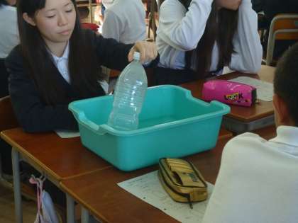 ペットボトルに熱湯を入れてフタをして、水の中に入れるとペットボトルがくしゃくしゃとへこむ実験をしました。