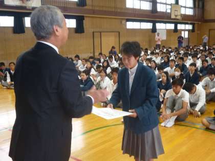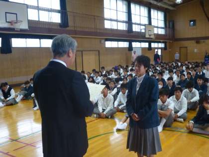 本校の女子ラガー、綿本弥沙希さんの賞状伝達がありました。