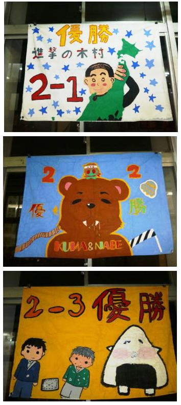 体育大会で使用した全クラスの学級旗を廊下に展示していました。