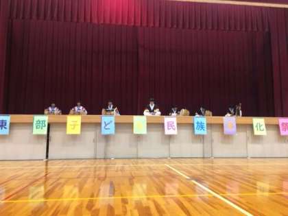 11月2日(土)に舎利寺小学校、桃谷高校で東部子ども民族文化祭がありました。生野区、東成区の小・中学校がたくさん参加し、本校からも国際クラブ「チョソン研」の生徒7名が参加しました。文化発表会で演奏した「サムルノリ」を披露しました。少し緊張していましたが堂々と演奏していました。全体交流ではアリランに合わせて遊んだり、オッケチュムをみんなで踊ったりしました。また来年も参加し、たくさんのチングたちと交流を深めてほしいです。