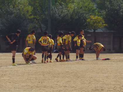 後半のトライ後のゴールキックを決められてノーサイド、対戦相手との試合後の礼の直前、新巽中ベンチへのあいさつの様子です。