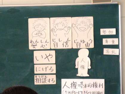 1年生は11月14日(金)と11月18日(火)の2日間で、50分×2校時×2日のCAPプログラムを通して、子どもの人権を尊重した暴力のない社会の実現をめざす学習をしています。