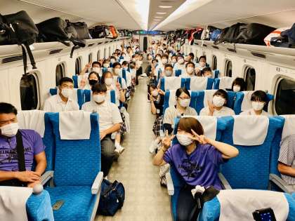 新幹線での様子です。ゲームをしたりお菓子を食べたりと楽しい移動の時間を過ごしている様子です。あっという間の新幹線です!