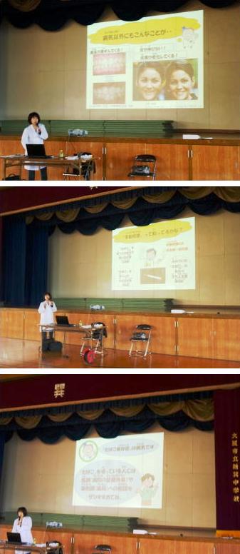 「薬物乱用防止教室」は最初にくすりの正しい飲み方を学習し、次にたばこがからだに及ぼす害についてのスライドを見ました。