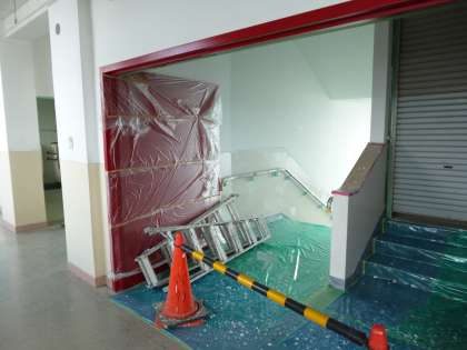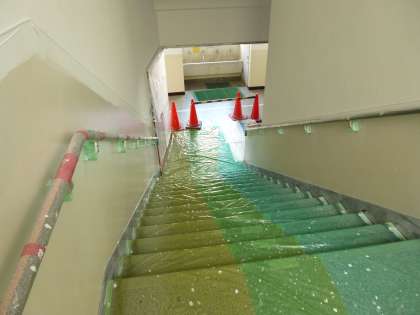 西階段を通行止めにしているため、生徒の皆さんには大変迷惑をかけていると思いますが、2月5日(木)の完成まであとしばらくお待ちください。