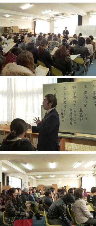 校長先生、教頭先生、教務主任、生徒指導主事、外国人教育主担等から新巽中学校についてのいろいろなお話や説明がありました。