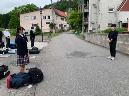 各クラス朝食後、退館式を終えてラフティング会場へ向かっています。