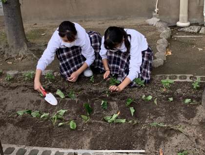 管理作業員さんに「さつまいも、植えてみる?」と声をかけていただいたので、さっそく1年2人と2年2人(そして顧問1人w)で植えました。
