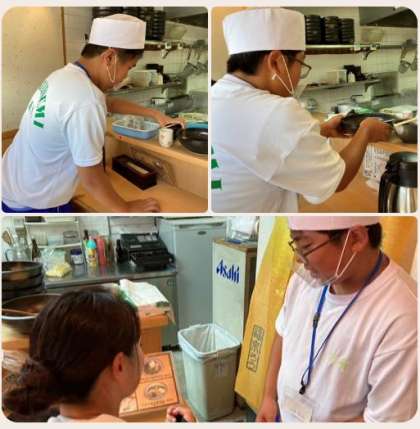 『麺工房 こさん』では、お客様の注文を聞いています。食後の洗い物も頑張ってくださいね。