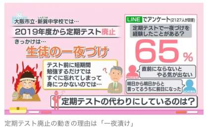 『大阪市立新巽中学校では2019年度から定期テストを廃止しました。きっかけは生徒の「一夜漬け」。これでは学習習慣が身につかないと感じた新巽中学校の先生たちは定期テストを廃止する方向へと動き出します。そのかわりに実施したのが「単元テスト」です。単元というのは数学で言えば二次方程式や三角関数など勉強するまとまりのこと。多い教科は年に15回ほど実施したそうです。テストを継続して行うことで「主体的に学ぶ習慣」をつけてもらうことがねらいです。』と、紹介がありました。
